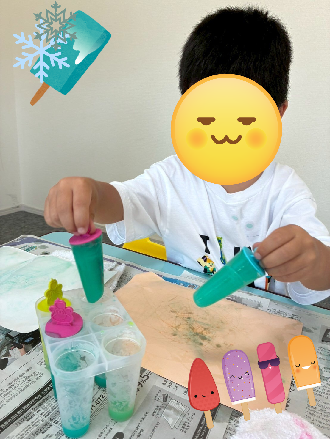 プールを楽しみながら氷で作った絵の具でお絵描き、