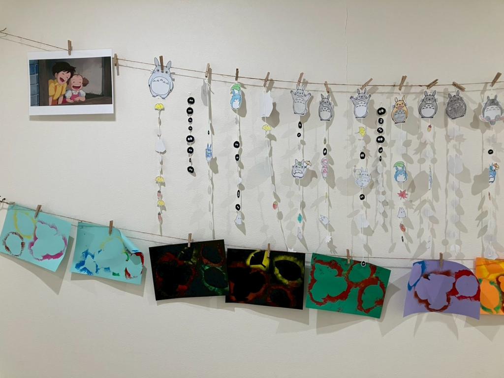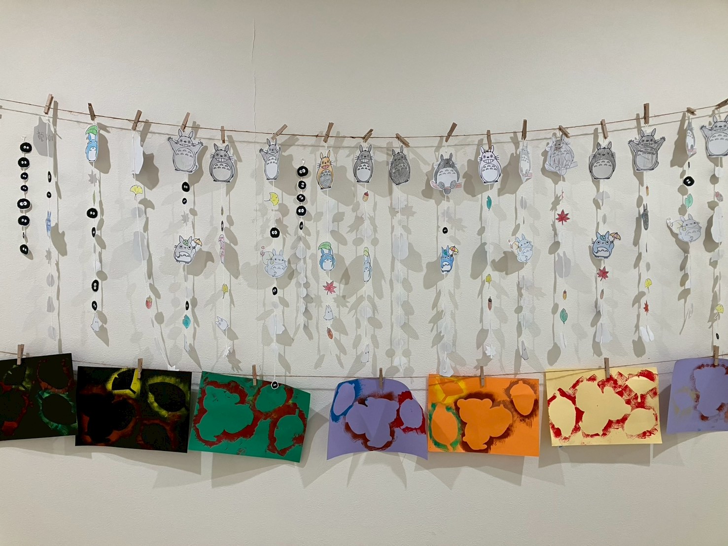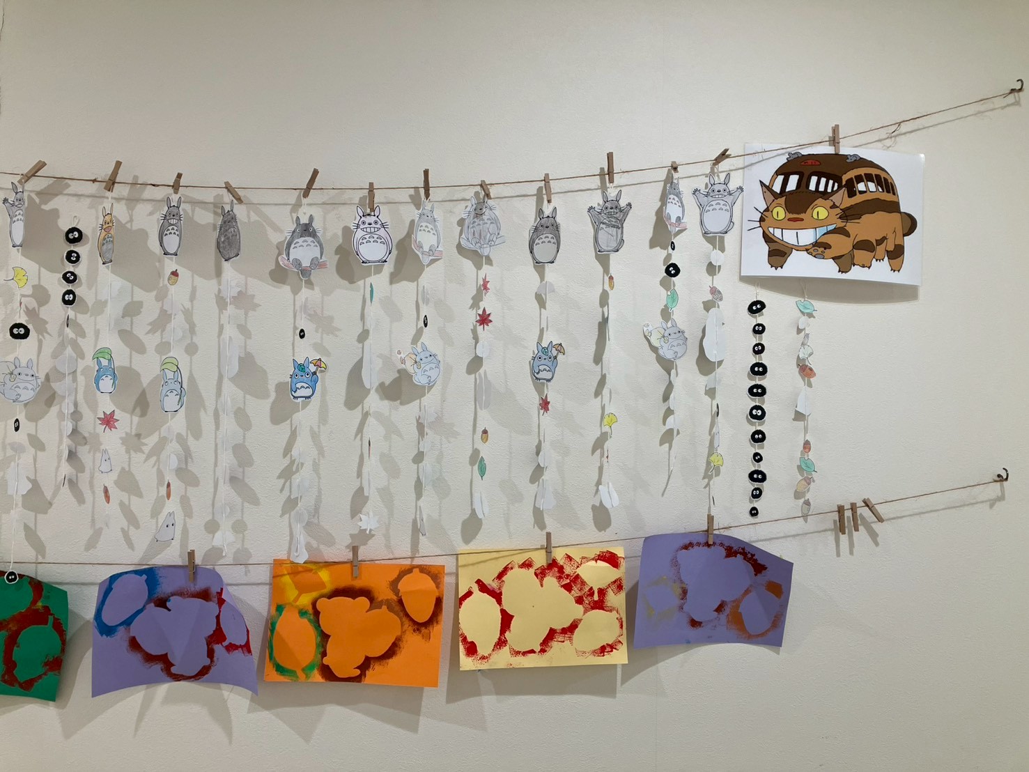 完成した作品を紐で吊るすと、空調の風でゆらゆらと動き出し、まるでトトロたちが森の中を散歩しているような、賑やかで温かい空間になりました。